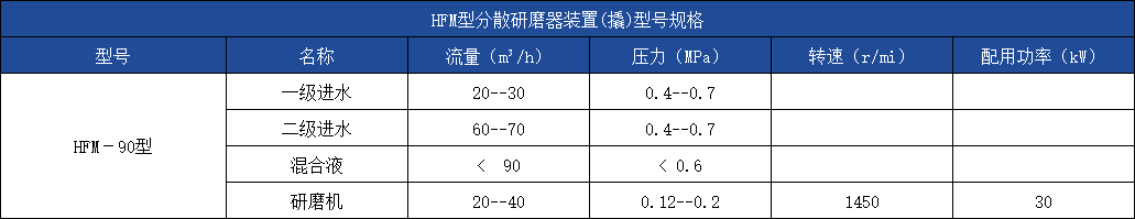 HFM型分散研磨器装置(撬)由溶解罐、分散研磨机和混合器组成。溶解罐设有切向的一次进水口,进水与上部的物料进入罐内,罐顶的搅拌机使其旋转搅拌,达到初步的混合。随后由下部的出口进入分散研磨机,使通过机器的物料能同时完成粉碎、分散、乳化、均质和输送。混合器利用文丘里管形分配器把分散粉碎机的来液和二次进水送入旋流混合和静态混合,以达到均匀分散溶解的最佳效果。